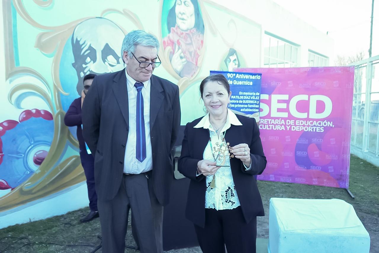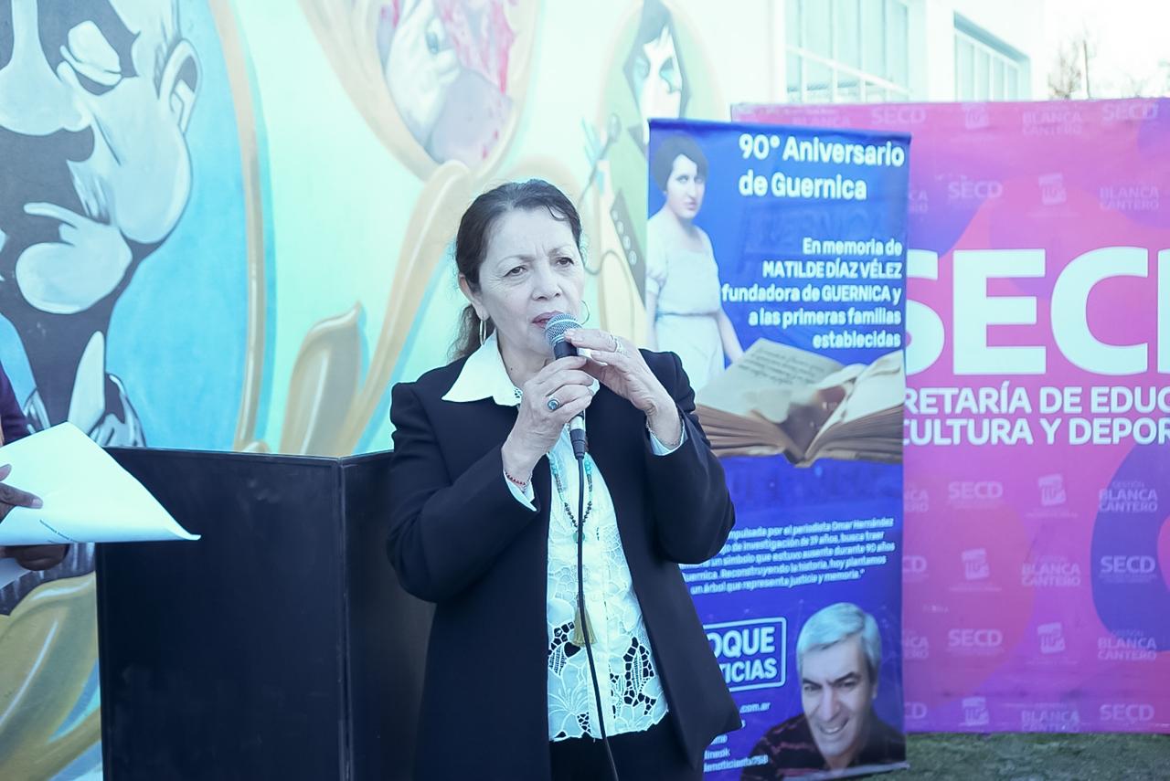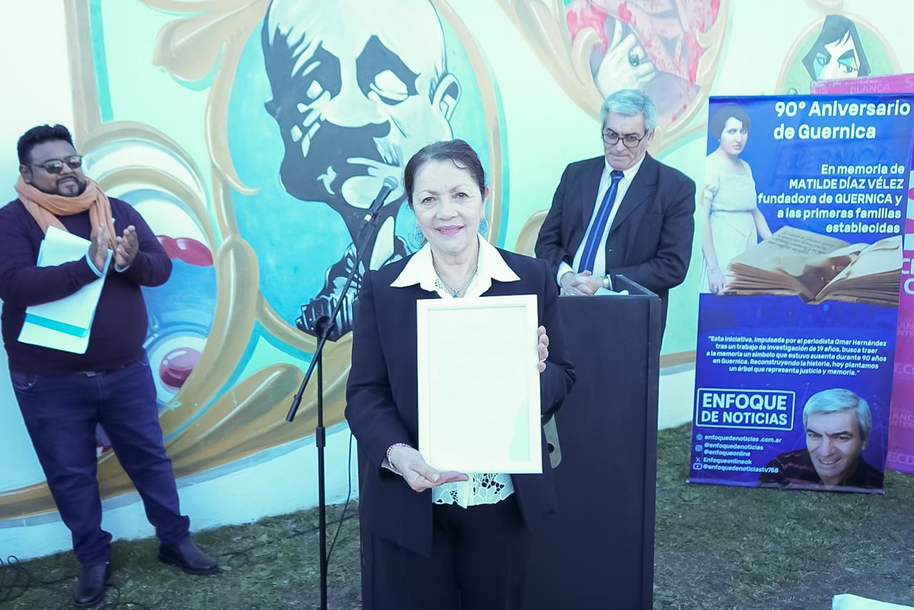 Un evento emotivo en el que se recordó a las primeras familias y pioneros que habitaron Guernica. También se hizo mención a Mathilde Díaz Vélez, que en 1934 solicitó al Gobierno provincial fundar un pueblo llamado “Guernica” en tierras de su propiedad, ubicada en aquel entonces en el partido de San Vicente a la altura del Km. 32 del Ferrocarril del Sud.