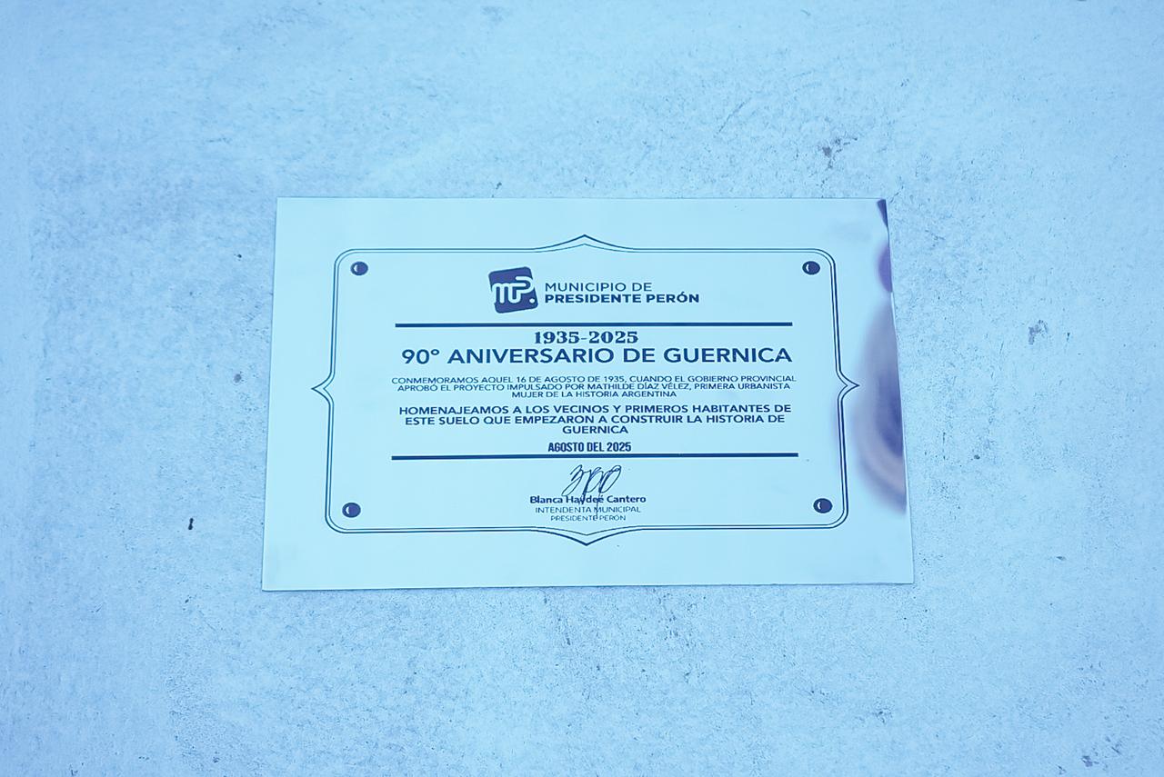 Este jueves 28 de agosto, la intendente Blanca Cantero encabezó el acto por el 90º aniversario de la localidad de Guernica, en el anfiteatro municipal “Homero Manzi”. Durante la ceremonia se descubrió una placa recordatoria y se plantó retoños del árbol de roble, símbolo de raíces y futuro, junto al lugareño Ricardo Amaya, autoridades, entre otros vecinos.
