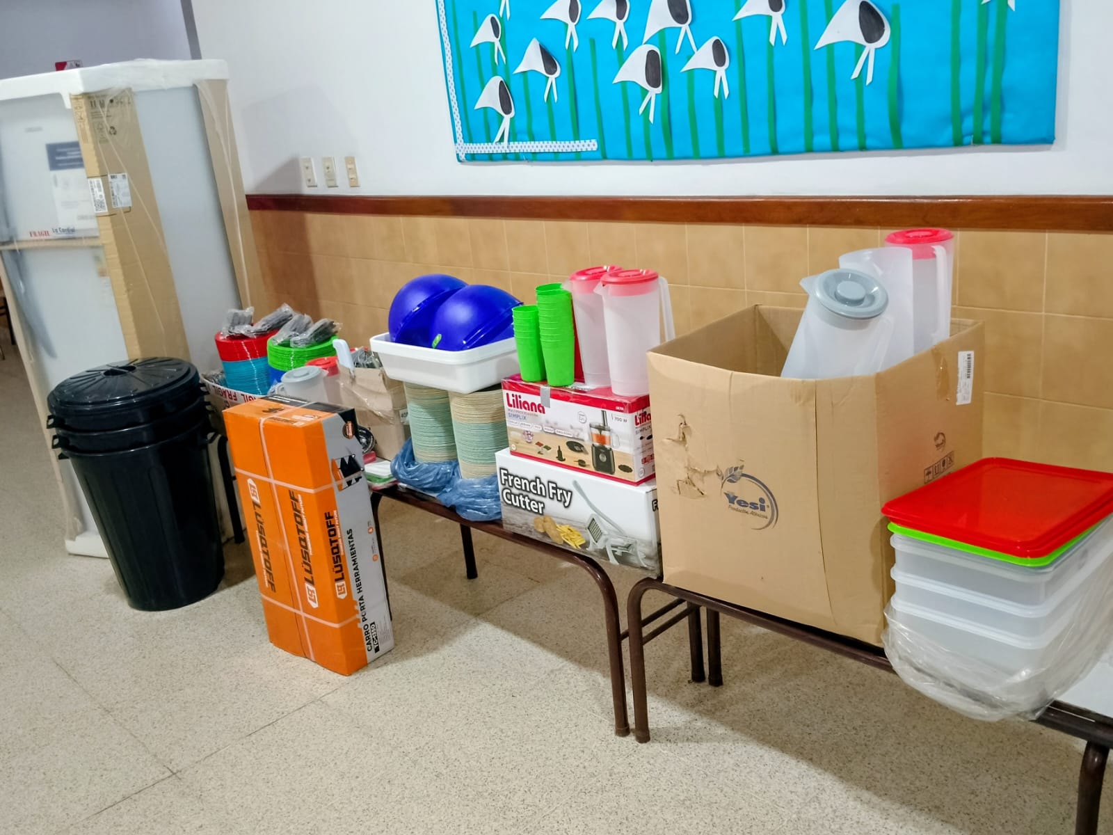 Entre los artículos entregados: una heladera nueva, una multiprocesadora eléctrica, una cortadora industrial de verduras y una variedad de utensilios, incluyendo platos, tazas y cubiertos, todos ellos necesarios para la elaboración de comidas.
